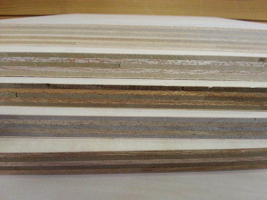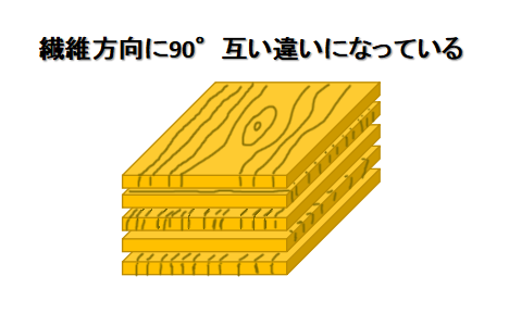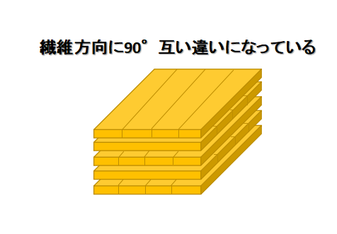 この材料は薄くスライスした木材を繊維方向を90°互い違いに重ねて作った板です。