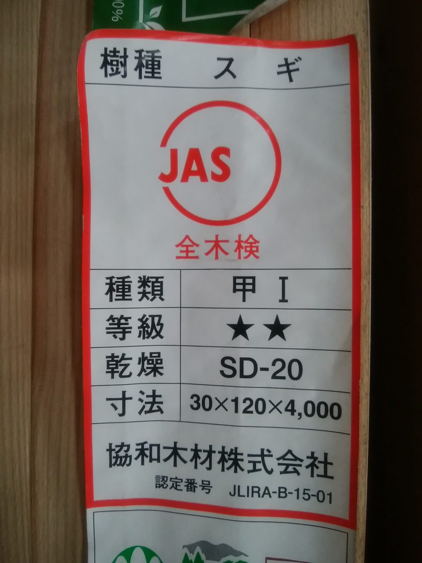 JAS材にはJAS認定された際に写真のようなシールが貼られます。
