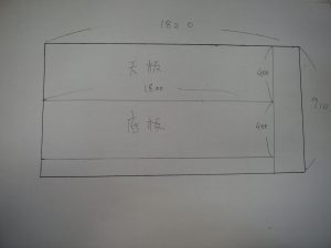 写真は少し大きめの棚を作る為の天板と底板の木取図です。1820×910という既製サイズの合板から木取りしています。